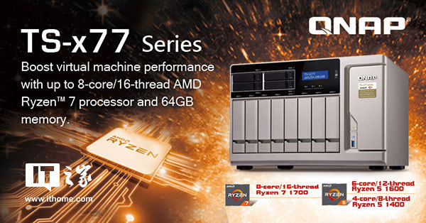 TS-x77系列NAS将提供6、8和12种盘位,配备AMD Ryzen 7(8核/16线程)和AMD Ryzen 5(6核/12线程和4核/线程)处理器,支持AES-NI加密加速和64GB的DDR4 RAM。该系列中的每个型号都提供三个PCIe 3.0插槽,用于支持10GbE / 40GbE NIC,PCIe NVMe SSD和USB 3.1扩展卡。